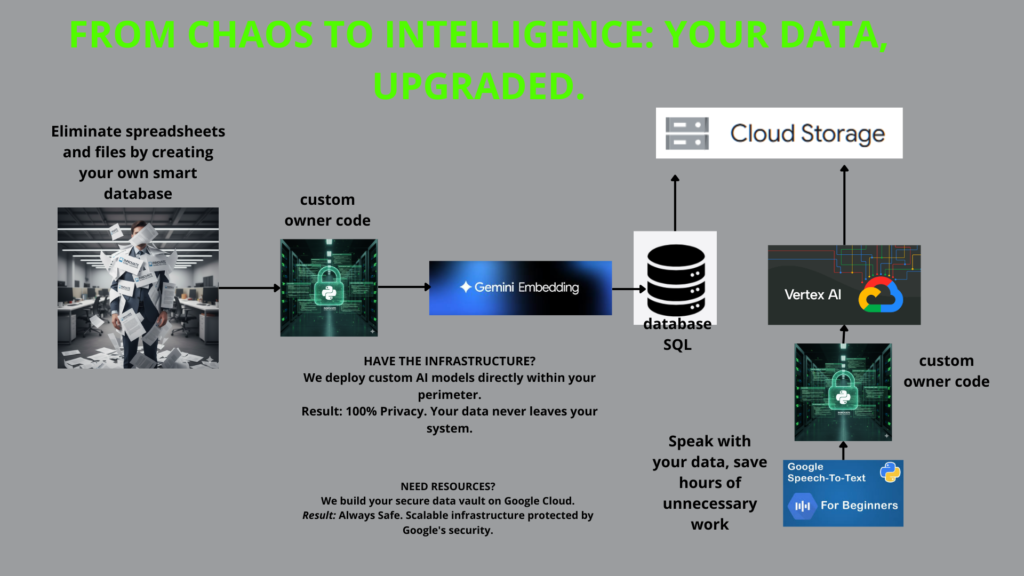 Non hai l’hardware necessario o preferisci una soluzione più agile e scalabile? Sviluppiamo e implementiamo tutte le tue soluzioni direttamente sulla piattaforma Google Cloud. Questa opzione ti garantisce un modello di spesa a consumo, eliminando la necessità di investimenti iniziali in hardware e offrendoti scalabilità illimitata, affidabilità e costi ottimizzati, pagando solo per le risorse che utilizzi.
