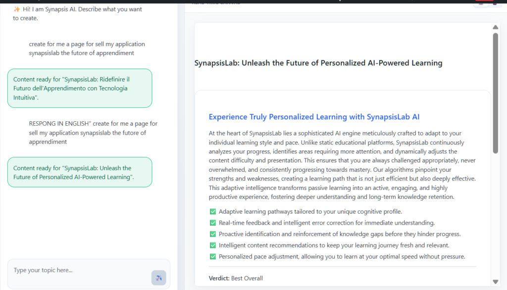 Immagina di poter creare una pagina web perfettamente ottimizzata e pronta per il posizionamento, semplicemente fornendo un titolo. Con SynapsisLab Ai Perfect SEO, questa visione diventa una realtà quotidiana. Il nostro plugin è stato progettato per eliminare la complessità dalla creazione di contenuti, permettendoti di concentrarti su ciò che conta davvero: il tuo messaggio. Inserisci il testo del titolo desiderato e lascia che l’AI faccia il resto. Attraverso algoritmi avanzati, il plugin elabora il titolo, comprende l’intento di ricerca e genera un contenuto completo, ben strutturato e già ottimizzato per i motori di ricerca. Questo processo non solo accelera drasticamente i tempi di pubblicazione, ma assicura anche che ogni pagina sia di alta qualità e mirata a ottenere un ranking SEO superiore a 50. La tua produttività raggiungerà livelli mai visti prima.
